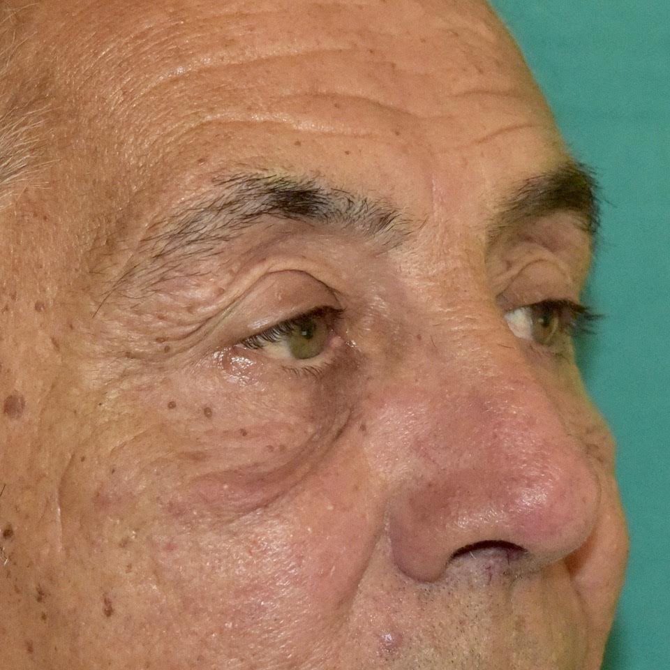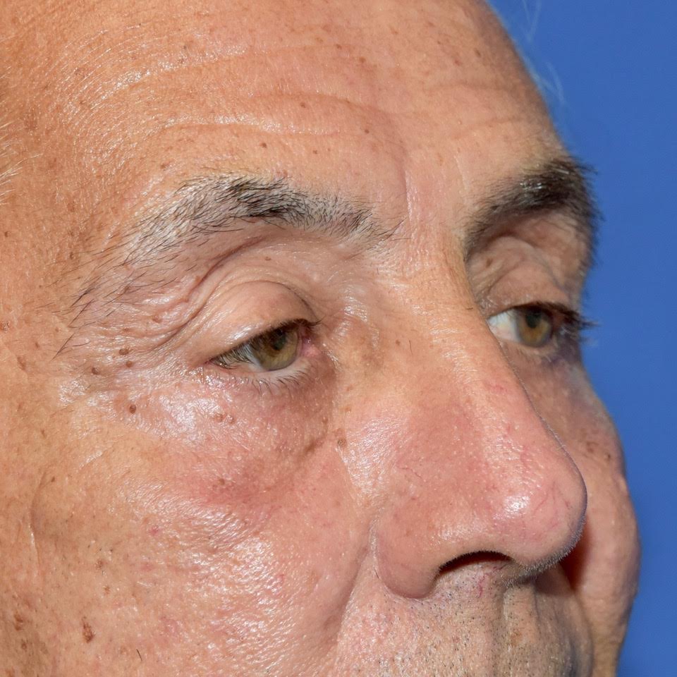 This 65 year old gentleman had festoons on his cheek (malar) from descent of skin and tissues that have been lifted back into a more normal position by a combination of lower eyelid blepharoplasty through a subciliary incision combined with a cheek lift.